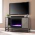 Modernize your cozy living space with this electric fireplace console. Textured doors tuck away movies and books, while adjustable shelves let you customize your storage space. Shimmering faux crystal adds ambiance with flickering LED flames, alternating colors, and lifelike embers, all from the convenience of your sofa. Turn up the heat in style with this electric media fireplace.