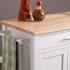Cultivate your culinary side with this multifunctional, white kitchen cart. The natural finish butcher block countertop functions as a buffet table and can travel for serving or lock into place to host the party. Double-door cabinet and open shelves offer waves of storage in this convenient island. Towel rack ensures dry hands are never far from reach and drawer stores kitchen utensils at the ready. Versatile, transitional style blends with soft country charm or coastal decor. Multipurpose storage and functionality serve the kitchen, craft room, or laundry room.