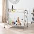 - Materials breakdown: Top: 5mm tempered glass; Storage: 5mm tempered glass; Frame: 20mm plated iron, 16mm plated iron, 13mm plated iron; Legs: Castors w/ brake, castors w/o break
